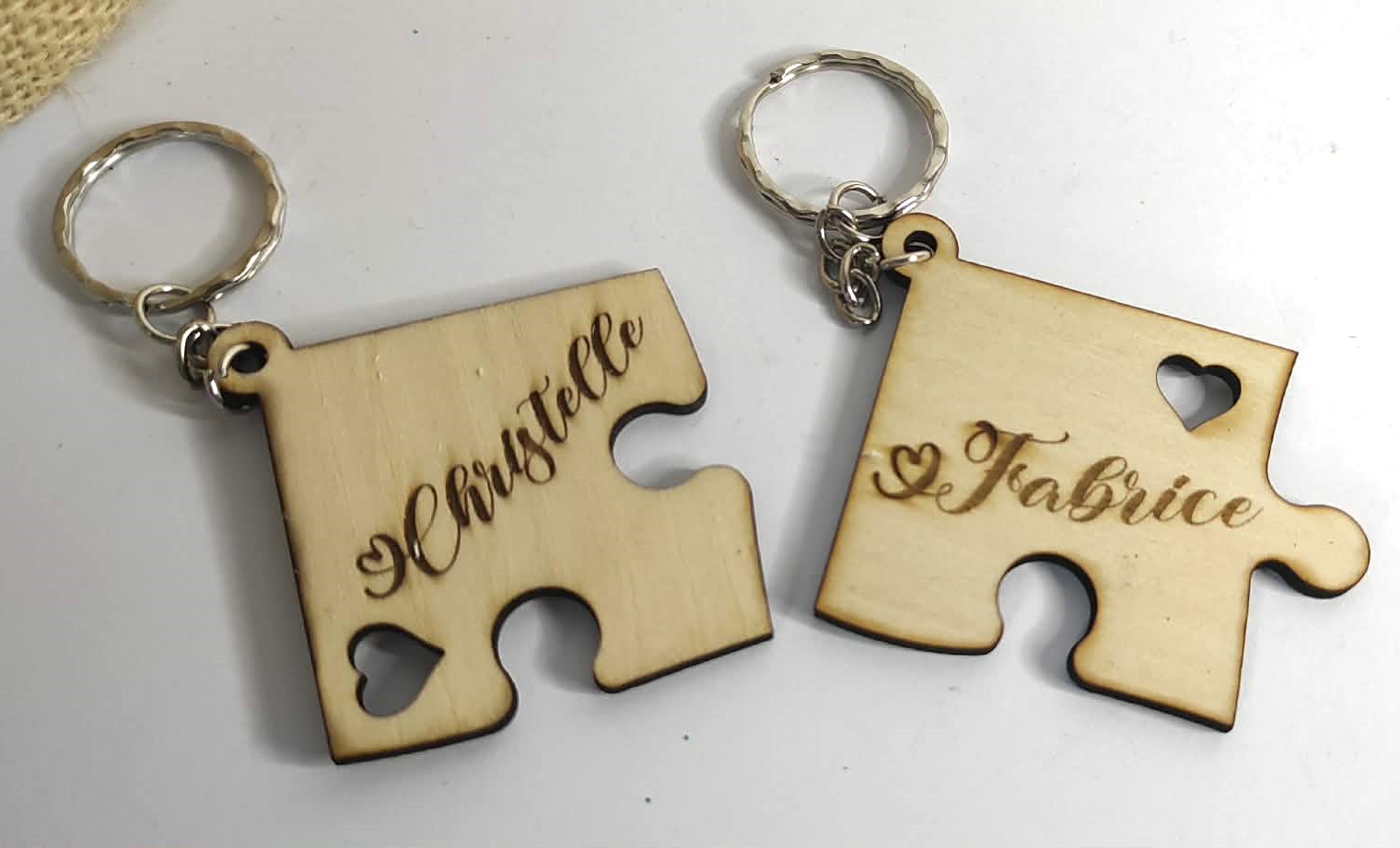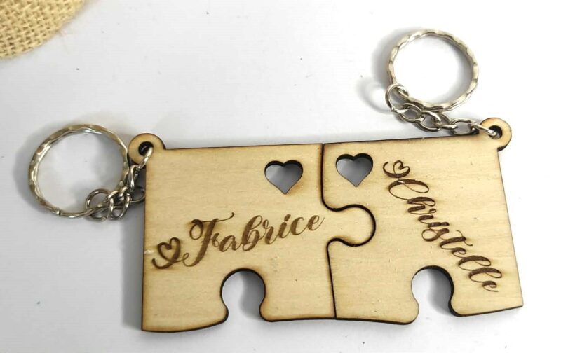 Exprimez votre amour avec ce duo de porte-clés en forme de puzzle, découpés avec précision dans du bois de tilleul de 3 mm d’épaisseur.