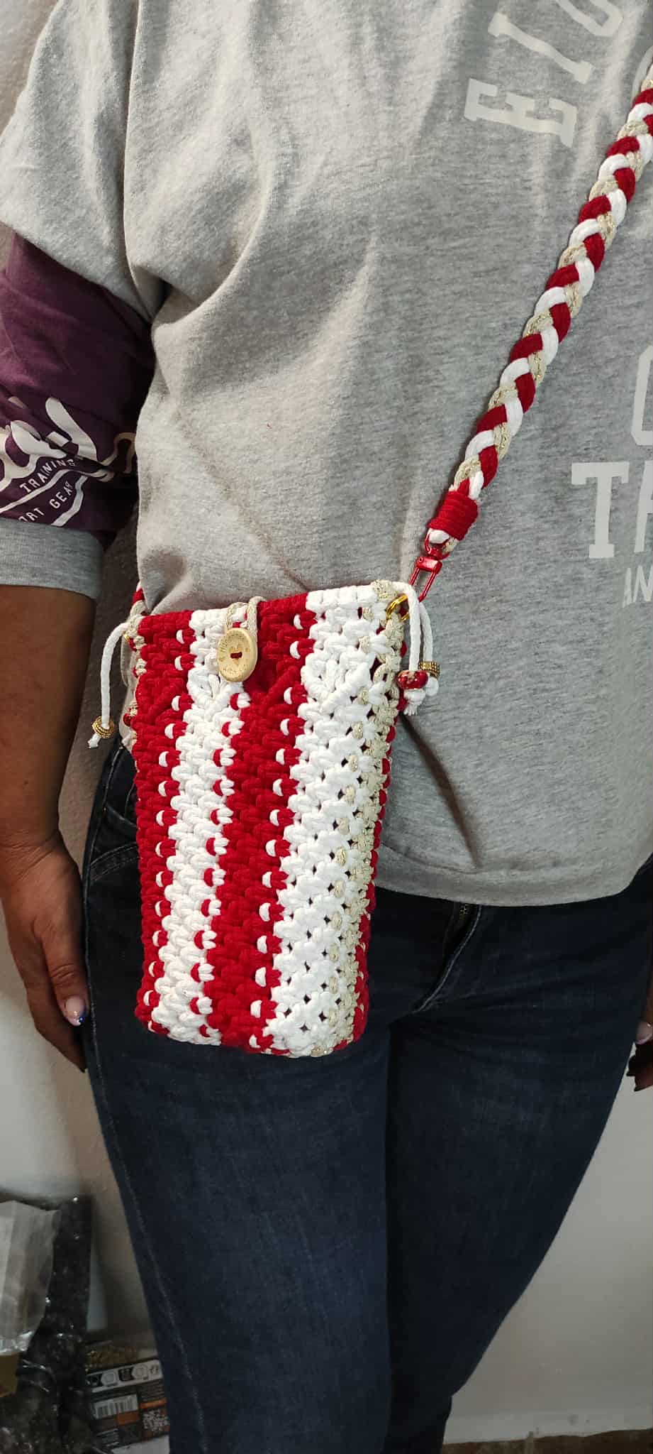 Adoptez un style unique avec ALLO, un sac en macramé fait main qui allie modernité et tradition. Confectionné avec un tressage minutieux en rouge, blanc et écru doré, il joue sur les contrastes pour un look chic et intemporel. Léger, souple et résistant, il vous accompagnera aussi bien en journée qu’en soirée, apportant une touche bohème et raffinée à votre tenue.