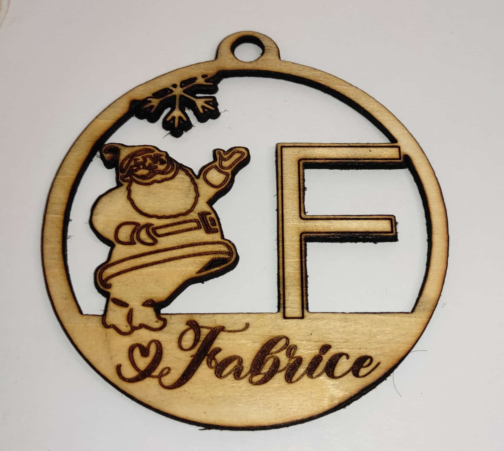 Apportez une touche chaleureuse et magique à votre sapin avec la Boule de Noël Père Noel Initiale, soigneusement découpée au laser dans un bois naturel de 3 mm.